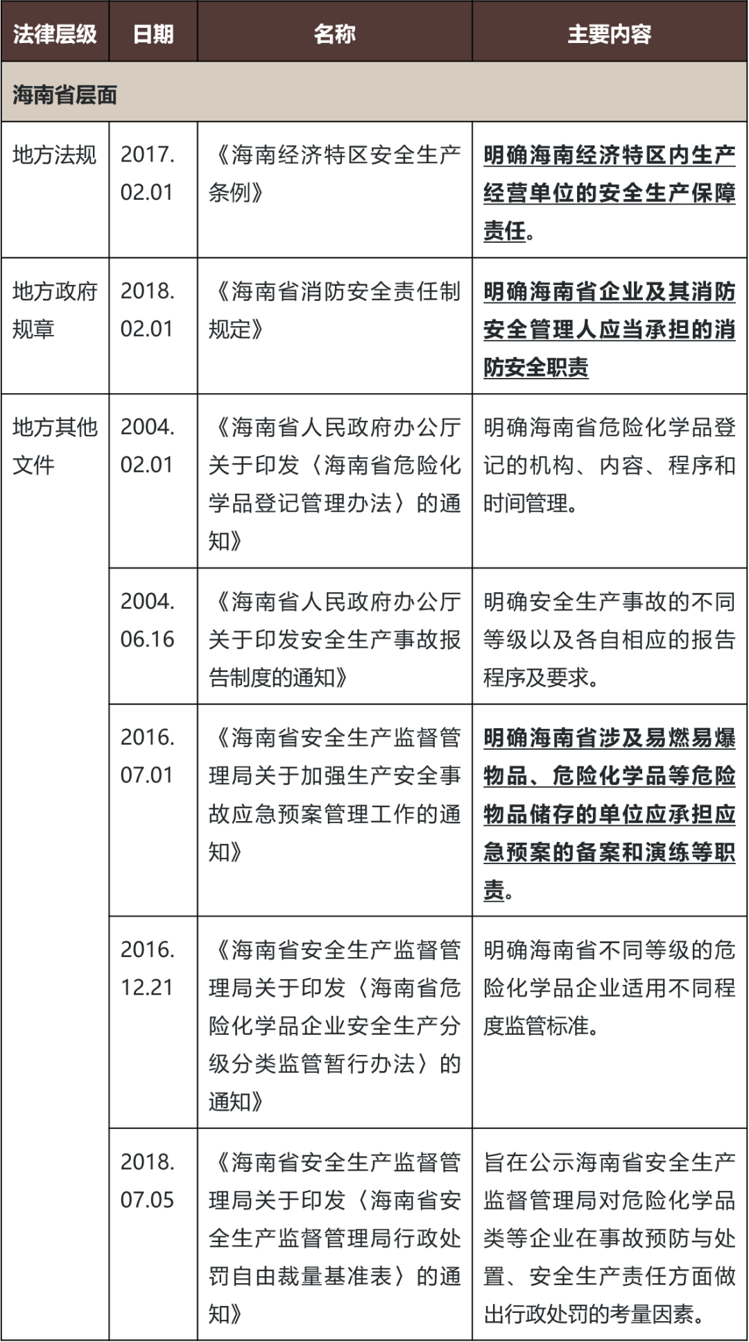 法律法规和政策文件对于引导企业开展安全生产必不可少。整体而言,国家层面上,我国形成了以《中华人民共和国安全生产法》(“《安全生产法》”)为核心的,涵盖危险物品、建筑、消防安全、职业病防治、生产安全事故等多个领域的法律规范体系。与此同时,地方层面上,海南省也制定了一系列的地方性法规、地方性政府规章及其他规范性文件,对海南企业的安全生产合规提出了更为具体的要求。在此,我们主要将海南省层面有关安全生产的主要法规和政策总结如下: